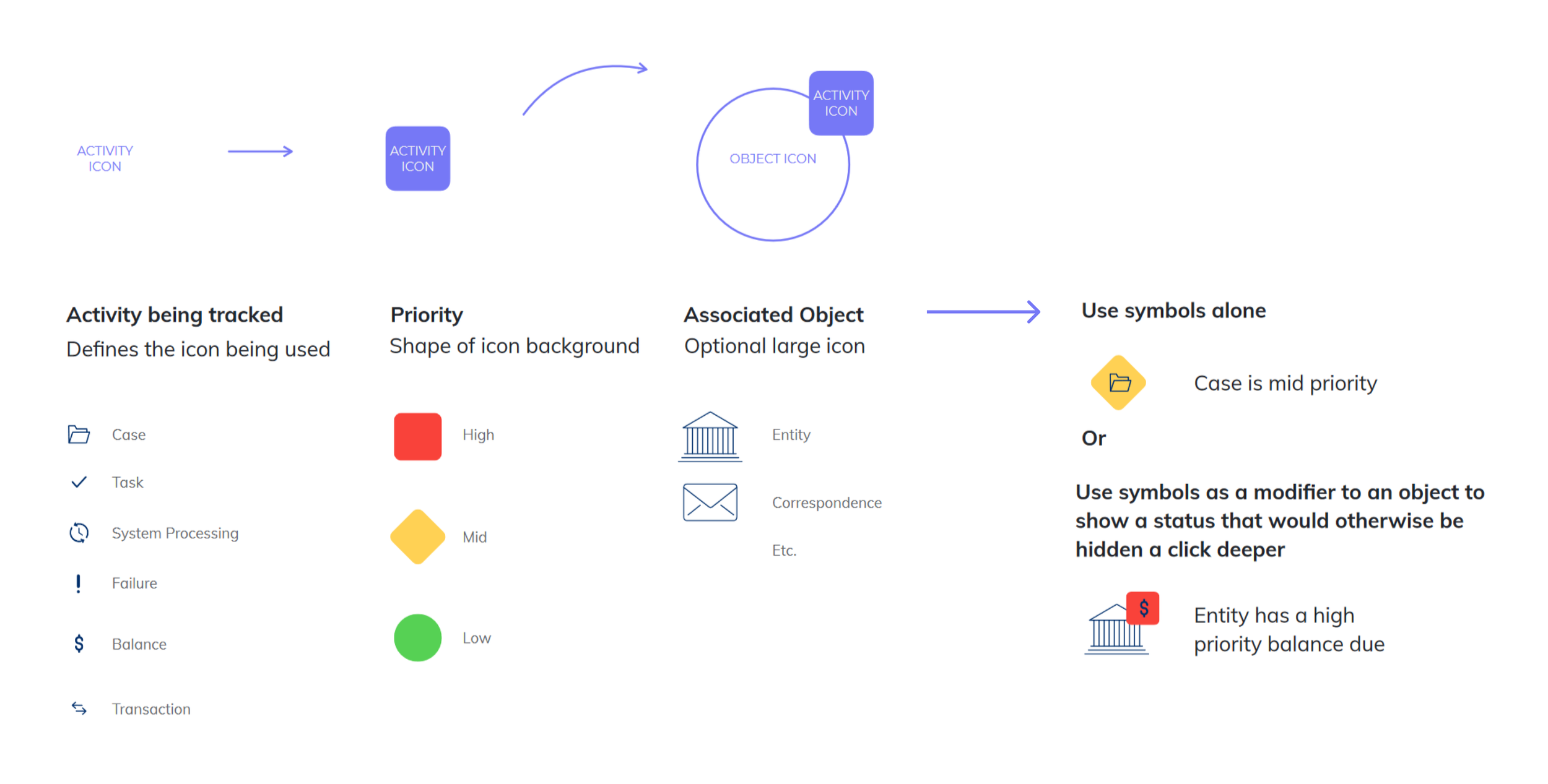 Activity defines the icon used and priority defines the shape of the icon background. Priority is currently only assigned to cases, but actions that are part of a case can inherit the priority ranking.