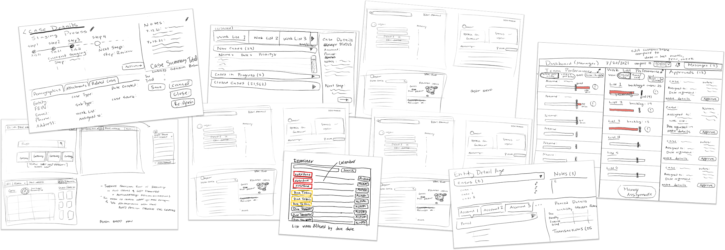 Leveraging the requirements and opportunities for improvement defined in the Discovery phase, I began sketching potential solutions alongside two supporting designers. The scope of the sketches ranged from feature-level to framework-level thinking, and included designs for tax examiners, managers, and customer service representatives for NextGen, and designs for taxpayers, tax preparers, and business owners for the RevX Online Services portal.