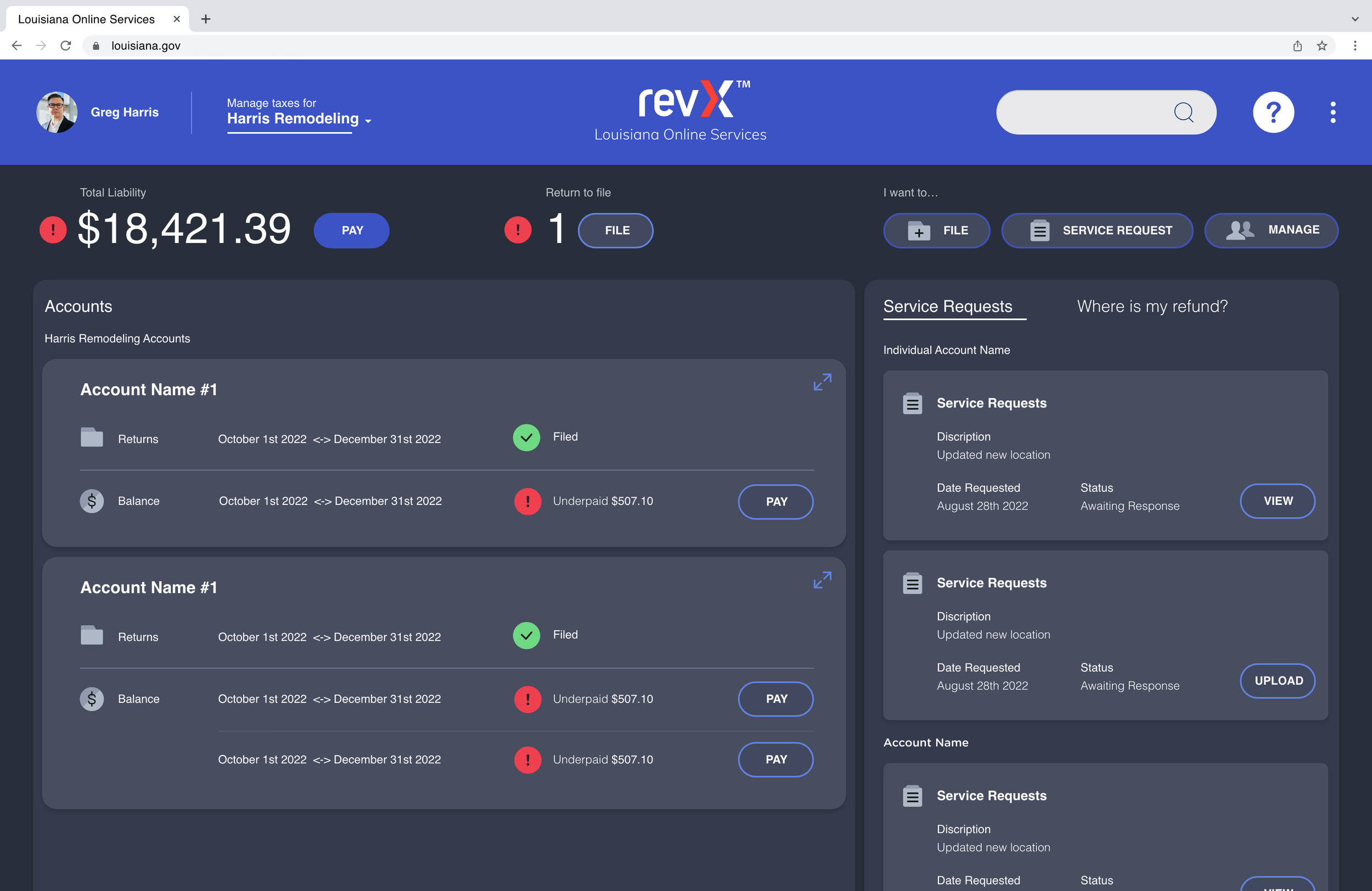 The RevX Online Services portal will make the collection and processing of money easier for business owners, taxpayers, and tax preparers by providing a trustworthy, modern way for users to manage payments, file returns, and make service requests with an interface that feels personalized without sacrificing professionalism.