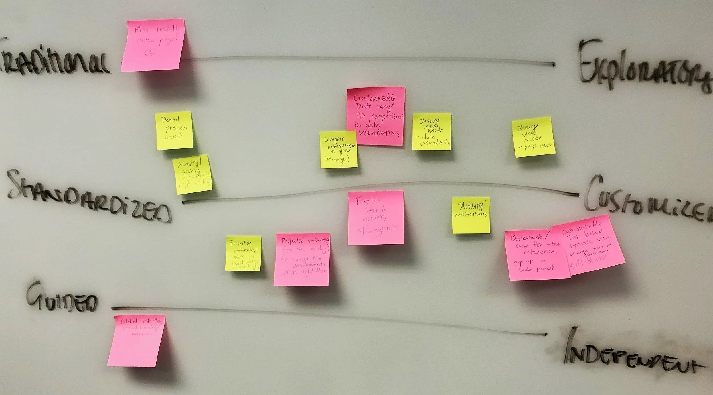 When we came together, we discussed our concepts and pulled out common themes and ideas, writing them on post-it notes and organizing them along several concept tension models—Traditional vs. Exploratory, Standardized vs. Customized, and Guided vs. Independent.